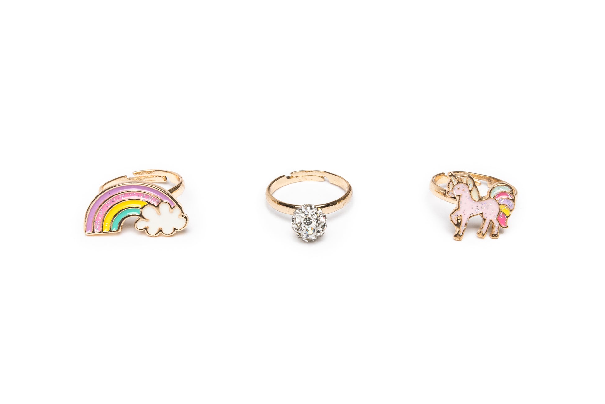 Magical unicorn-themed rings in vibrant rainbow colors. Perfect for little ones who love sparkle and whimsy. Each ring features a charming unicorn design with colorful enamel details. Set of 3 rings offers variety for mix-and-match fun. Adjustable sizing fits most children's hands comfortably. Durable and safe for everyday wear and imaginative play.